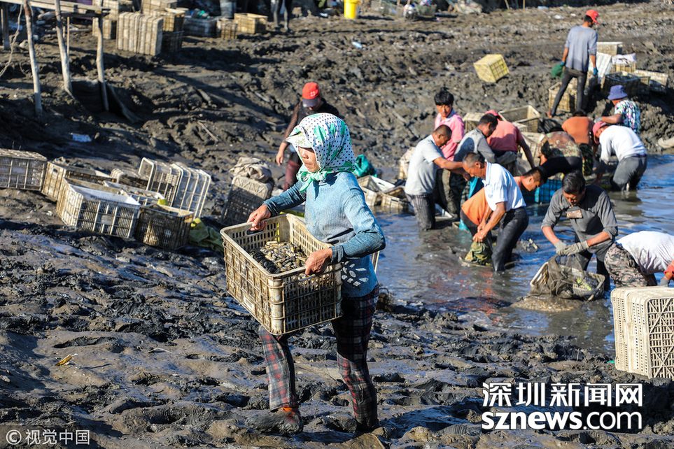 深圳新聞網(wǎng)訊 2018年9月8日,遼寧丹東,早上5點(diǎn),挖蟶人紛紛下到各個(gè)池子,要在海水海泥里艱辛勞作10小時(shí),直至下午3點(diǎn)集體上岸,等待買(mǎi)家的運(yùn)輸車(chē)隊(duì)運(yùn)走他們的勞動(dòng)成果。9月初,遼寧沿海養(yǎng)殖區(qū)進(jìn)入養(yǎng)殖海鮮的收獲季。在東港,常常出現(xiàn)數(shù)百人乃至上千人集結(jié)在池子里挖蟶子(這里特指縊蟶,即東港當(dāng)?shù)厝怂f(shuō)的小人仙。下同)的壯觀景象。在養(yǎng)殖海鮮的收獲季,成群的海鷗趁機(jī)“助陣“,人與大自然和諧共處的畫(huà)面令人嘆為觀止。