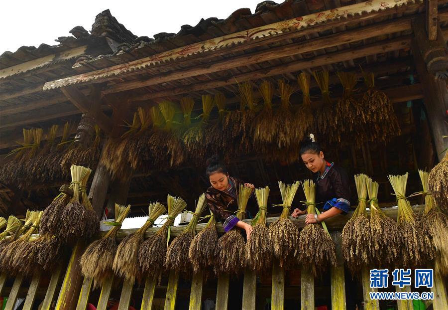 10月30日,在廣西融水苗族自治縣安太鄉(xiāng)元寶村,村民在風(fēng)雨橋上晾曬剛剛收獲的香糯。新華社記者 吳建路 攝