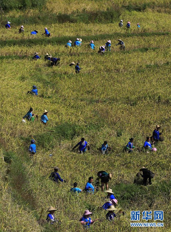 10月30日,在廣西融水苗族自治縣安太鄉(xiāng)元寶村,村民在收獲香糯。 新華社記者 吳建路 攝