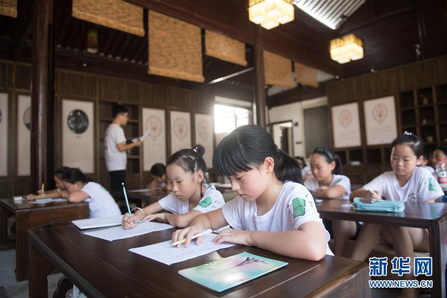 小學(xué)生在浙江省德清縣乾元鎮(zhèn)國學(xué)圖書館參加國學(xué)夏令營(2018年7月19日攝)。浙江省德清縣積極推進(jìn)鄉(xiāng)鎮(zhèn)特色圖書館建設(shè),將閑置老建筑改造成設(shè)計(jì)獨(dú)特、藏書豐富、活動多彩的圖書館,有力助推鄉(xiāng)村文化振興。新華社記者 翁忻旸 攝