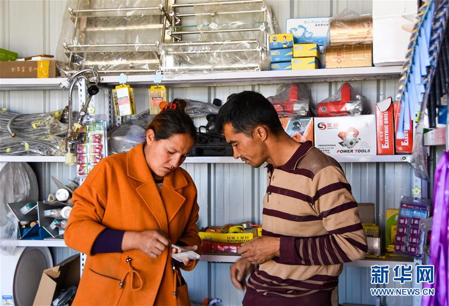 在位于澤普縣桐安鄉(xiāng)的建材鋪里,熱娜古麗·喀爾曼(左)跟前來(lái)購(gòu)買建材的顧客交談(10月28日攝)。 新華社記者 關(guān)俏俏 攝