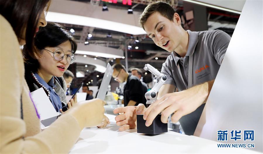 11月5日,庫(kù)卡公司工作人員(右)向參觀者展示機(jī)器人手臂模型。 新華社記者 方喆 攝