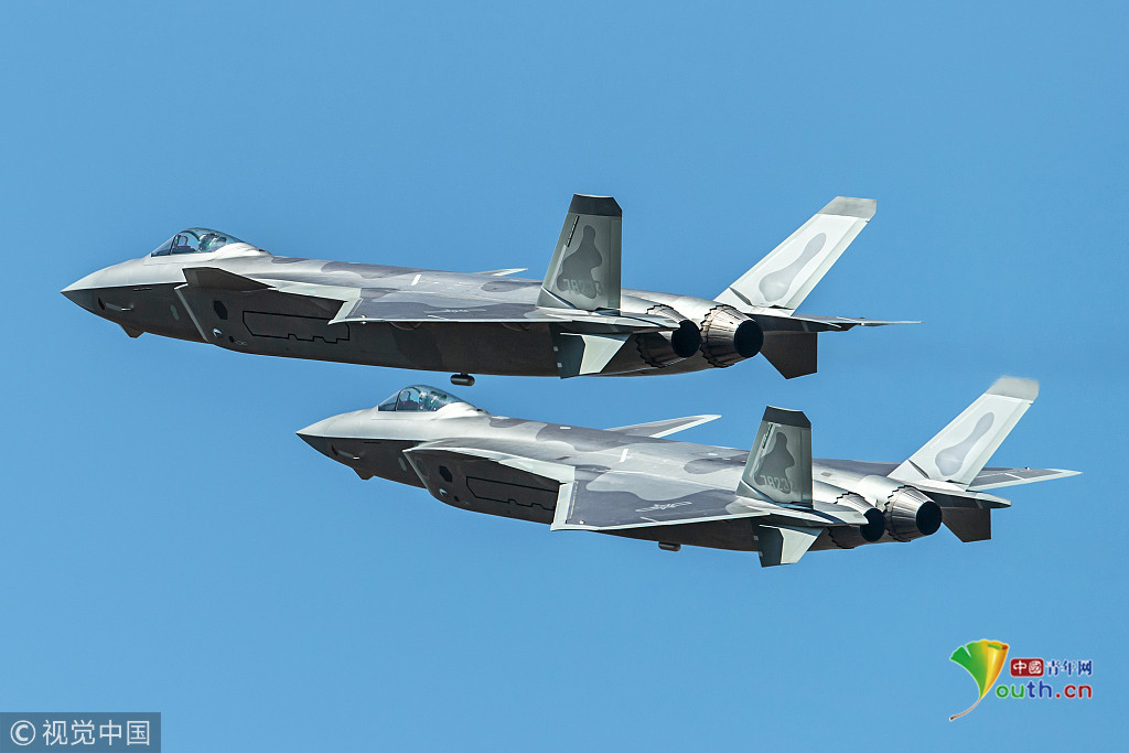 圖七:2018年11月6日,廣東珠海航展上,兩架殲-20戰(zhàn)機組成雙機編隊進行飛行表演。