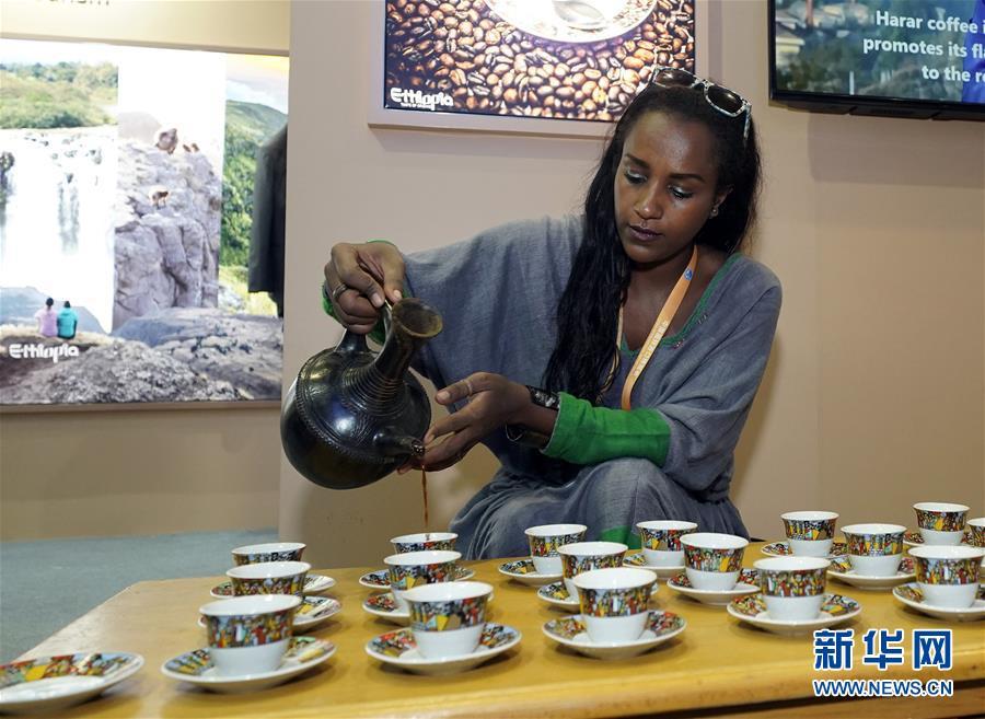 11月6日,在首屆中國國際進口博覽會上,埃塞俄比亞參展人員為參觀者倒咖啡。新華社記者 沈伯韓 攝