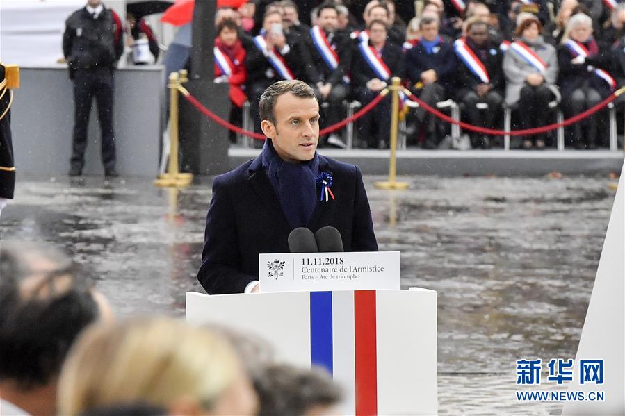 11月11日,在法國巴黎,法國總統(tǒng)馬克龍在紀(jì)念儀式上致辭。當(dāng)日,法國政府在巴黎凱旋門前舉行儀式,隆重紀(jì)念第一次世界大戰(zhàn)結(jié)束一百周年。新華社記者 陳益宸 攝