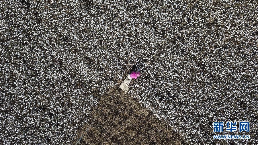 陳喜波的表嫂宋仙在新疆巴楚縣多來(lái)提巴格鄉(xiāng)卡扎尼塔皮提村的棉田中拾花(10月25日無(wú)人機(jī)拍攝)。