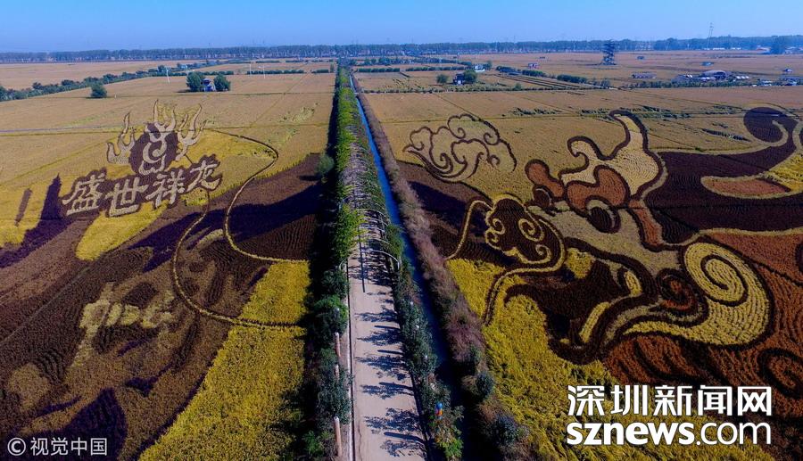 遼寧沈陽,金秋時節(jié),沈陽盛世祥龍、千手觀音、孔子、厲害啦我的國、求婚等主題總面積680畝、共15幅具有3D效果的巨幅稻田畫迎來最佳觀賞期。