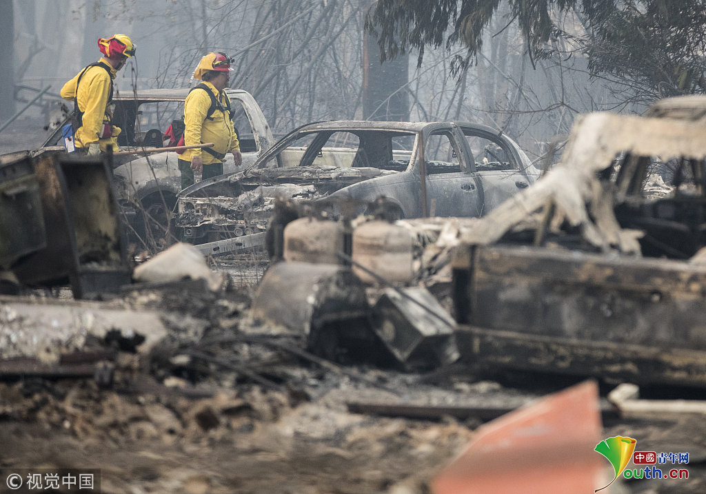 11月13日,在美國(guó)加利福尼亞州天堂鎮(zhèn),搜救人員在山火過(guò)后的廢墟工作。