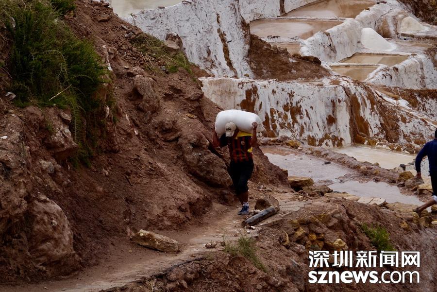 距神奇梯田不遠(yuǎn)的一條山谷里,有一個(gè)規(guī)模不小、歷史悠久的鹽礦。此地100萬年前是大海,地殼運(yùn)動(dòng)演變?yōu)殛懙匾院螅叵滤缓}分,古印加人發(fā)現(xiàn)鹽礦并運(yùn)用水平鹽田曬鹽,其工藝技術(shù)一直沿用至今。李仁奇攝