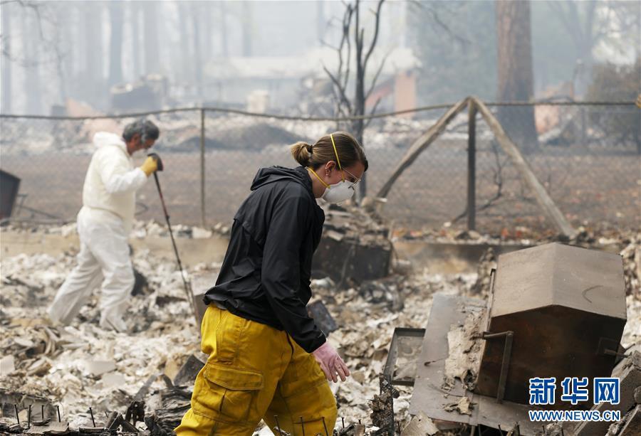 11月19日,在美國加利福尼亞州比尤特縣天堂鎮(zhèn),救援人員在山火廢墟中工作。