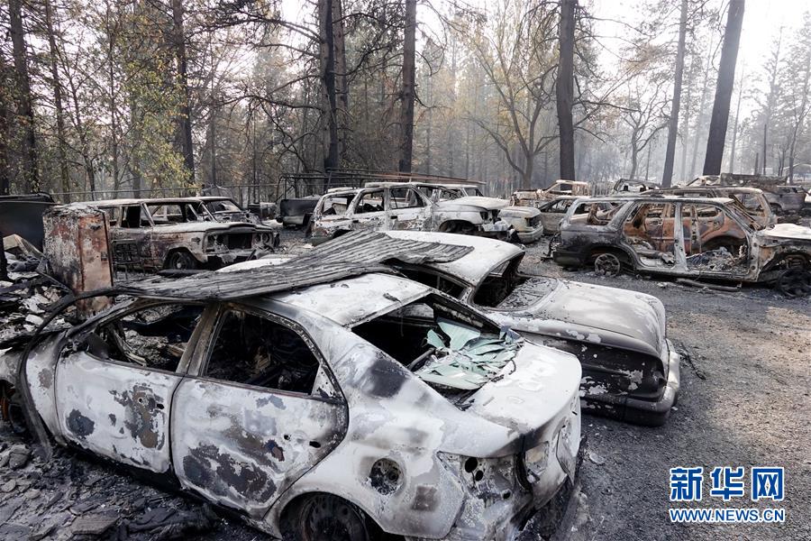 這是11月19日在美國(guó)加利福尼亞州比尤特縣天堂鎮(zhèn)拍攝的車輛殘骸和房屋廢墟。新華社記者吳曉凌攝