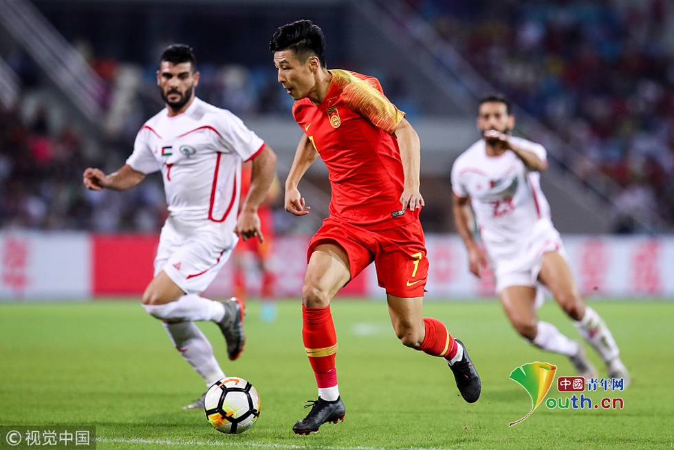 2018年11月20日,海口,2018國際足球友誼賽,中國男足Vs巴勒斯坦。郜林拼搶 圖片作者:null