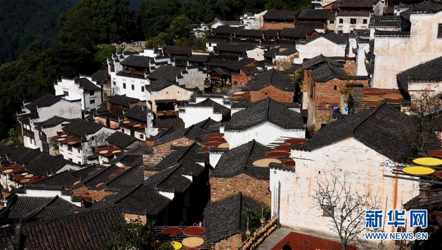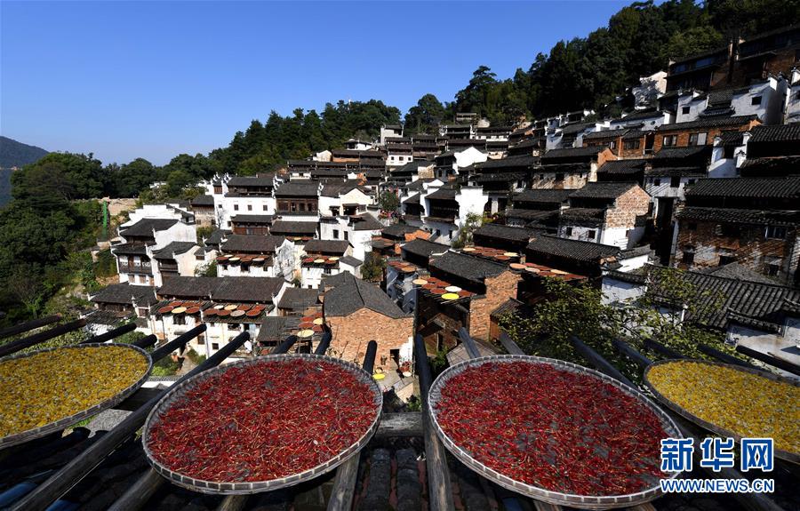 2017年10月26日拍攝的篁嶺古村。家家戶戶晾曬各種蔬果及皇菊。近日天氣晴朗,江西省婺源縣江灣鎮(zhèn)篁嶺村村民抓住時機采摘、晾曬皇菊及蔬果。明黃的菊花、火紅的辣椒……各種顏色將篁嶺古村裝扮成巨大的“調(diào)色板”,引來眾多游客感受鄉(xiāng)村美景。新華社記者宋振平 攝