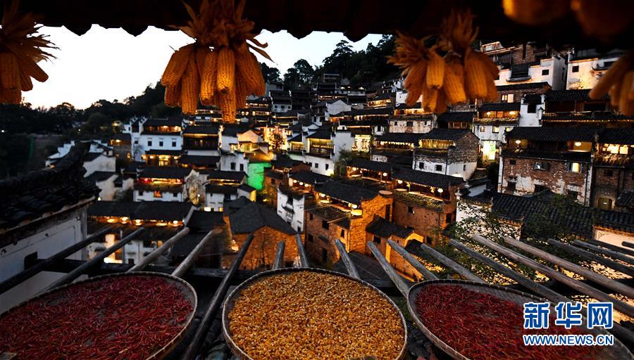 這是黃昏中的篁嶺古村(10月25日攝)。近日天氣晴朗,江西省婺源縣江灣鎮(zhèn)篁嶺村村民抓住時機采摘、晾曬皇菊及蔬果。明黃的菊花、火紅的辣椒……各種顏色將篁嶺古村裝扮成巨大的“調(diào)色板”,引來眾多游客感受鄉(xiāng)村美景。新華社記者宋振平 攝 |