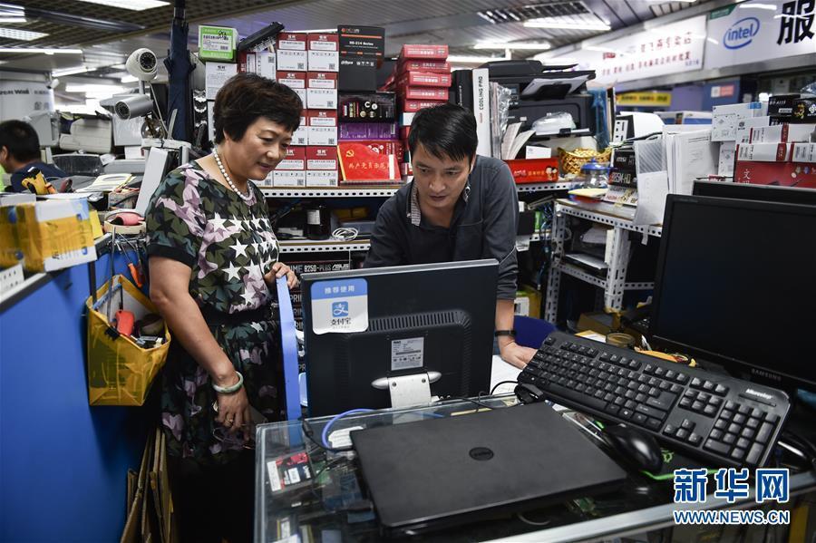 倪海真(左)到深圳華強(qiáng)北賽格電子市場五層的支部宣傳委員陳亞林柜臺前,與他溝通近期支部黨員學(xué)習(xí)的情況(2017年9月5日攝)。新華社記者毛思倩 攝 圖片來源:新華網(wǎng)