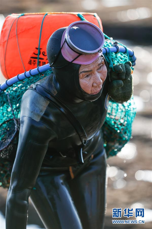 11月23日,一名海女在韓國濟(jì)州島的一處海岸附近結(jié)束作業(yè)后上岸。新華社記者王婧嬙攝