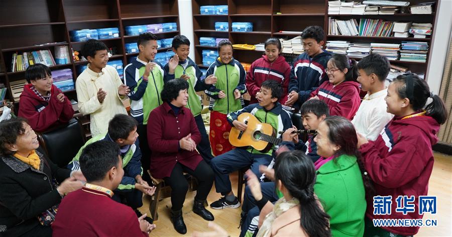 11月16日,南昌市第十七中學(xué)西藏班的學(xué)生為劉和平(中間紅衣者)及“愛心媽媽志愿服務(wù)團(tuán)”成員表演彈唱。新華社記者 胡晨歡 攝