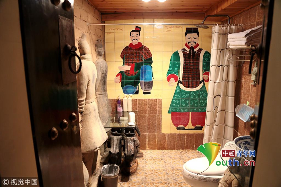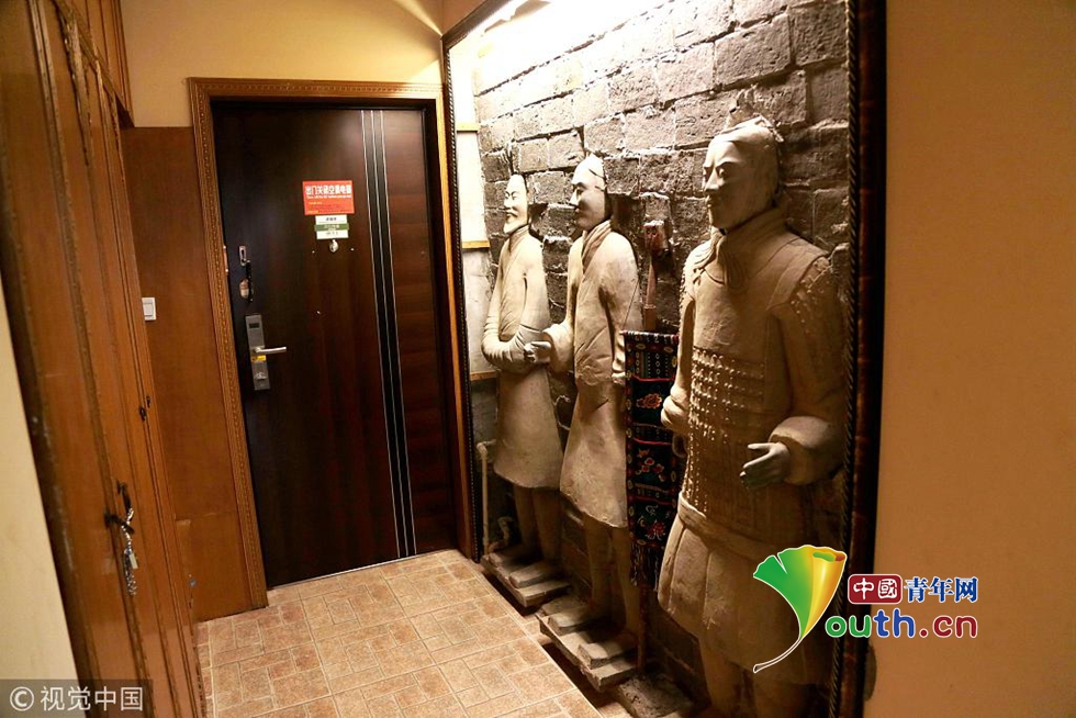 2018年11月27日,西安,民宿臥室內(nèi)的“兵馬俑”裝飾。近日,西安一家主打“兵馬俑”元素的民宿走紅,“兵馬俑”元素遍布在房間各個角落,“深情注視”著在此休憩的旅客,加上昏黃的燈光及復(fù)古的裝飾,讓不少旅客感嘆如同居住在“秦始皇陵”。 張遠(yuǎn)(陜西分社)/視覺中國