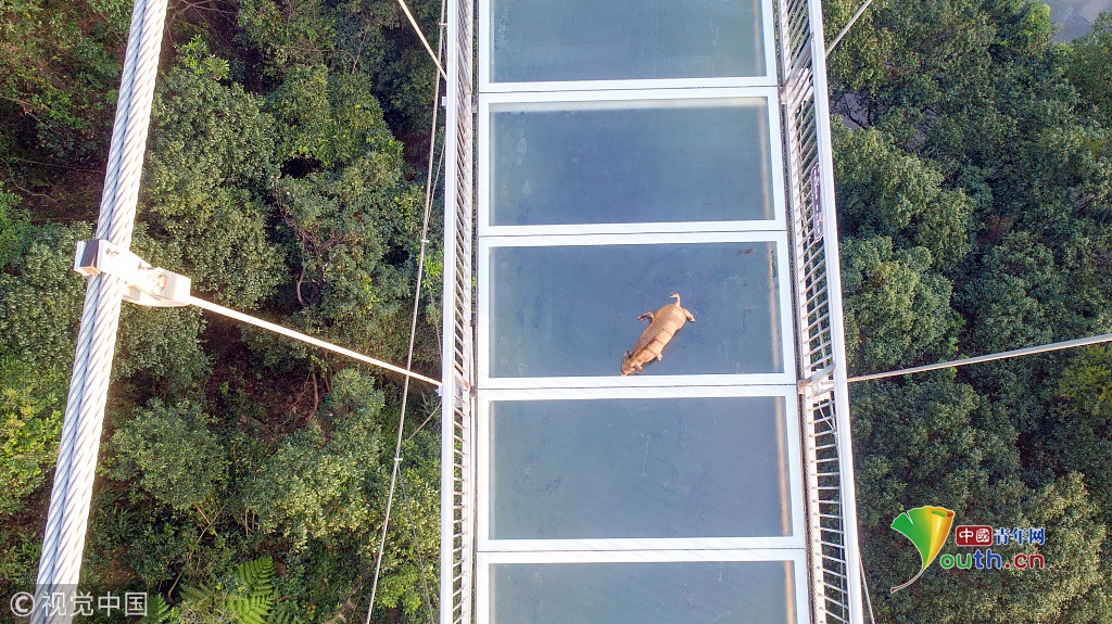 小野豬誤入玻璃橋嚇得發(fā)抖保安解救 豬:你們?nèi)祟愄膳铝?/h1>