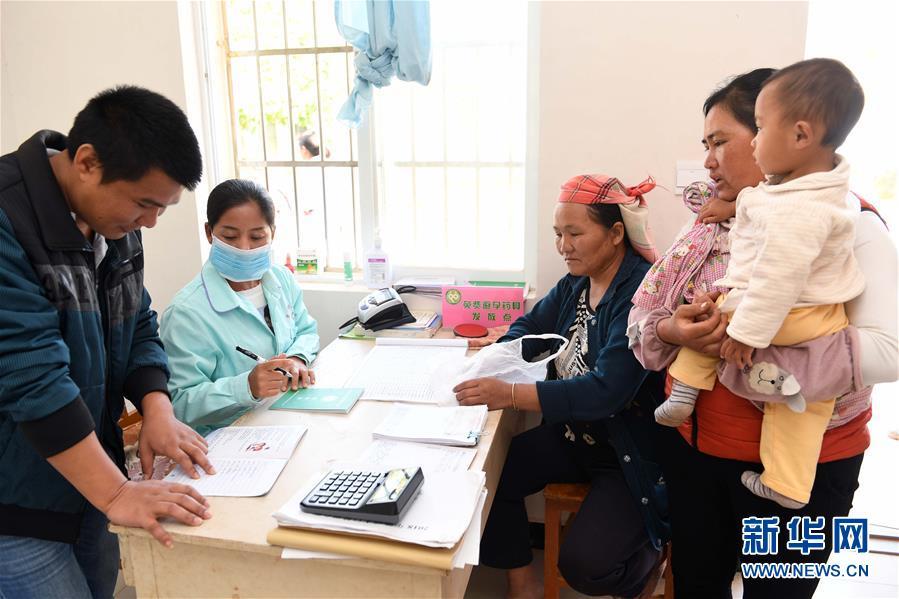 11月28日,張惠仙(左二)在巖因村衛(wèi)生室接待前來看病的村民。 新華社記者 楊宗友 攝