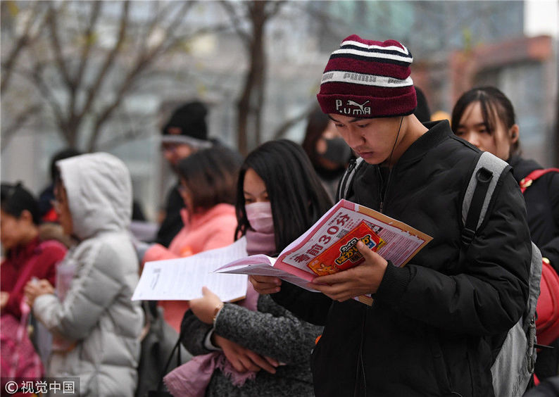 2018年12月2日,北京,參加2019年度中央機(jī)關(guān)及其直屬機(jī)構(gòu)公務(wù)員招考筆試的考生走入首都經(jīng)濟(jì)貿(mào)易大學(xué)考點(diǎn)準(zhǔn)備考試,步履匆匆。2019年度中央機(jī)關(guān)及其直屬機(jī)構(gòu)公務(wù)員招考筆試今日開考。本次國(guó)考計(jì)劃招錄1.45萬人,共有137.93萬人通過報(bào)名資格審查,平均競(jìng)爭(zhēng)比達(dá)到95:1,為近5年來最高,最熱崗位的競(jìng)爭(zhēng)超過4000:1。視覺中國(guó)