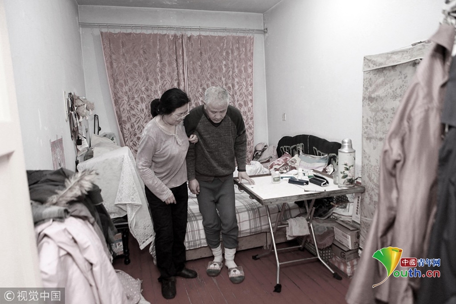 2018年11月22日,遼寧丹東,在出租屋內(nèi),袁東方的母親正在攙扶著老伴兒鍛煉身體。魏建順/視覺(jué)中國(guó)