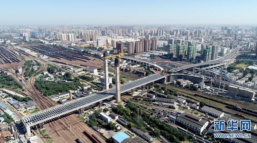 9月7日無人機(jī)拍攝的鄭北大橋鋼梁頂推施工現(xiàn)場(chǎng)。當(dāng)日,跨越鄭州北站的鄭北大橋鋼梁頂推成功。鄭北大橋是東西走向的鄭州市農(nóng)業(yè)路快速通道工程的一部分,需跨越鄭州北站。由于列車不能中斷運(yùn)行,鄭北大橋不能采用常見的搭腳手架方式施工,而是采用頂推法,即在大橋一端把橋身拼接好,然后一段一段朝著鐵路編組站上方送過去,最終完成橋梁架設(shè)。新華社記者朱祥攝