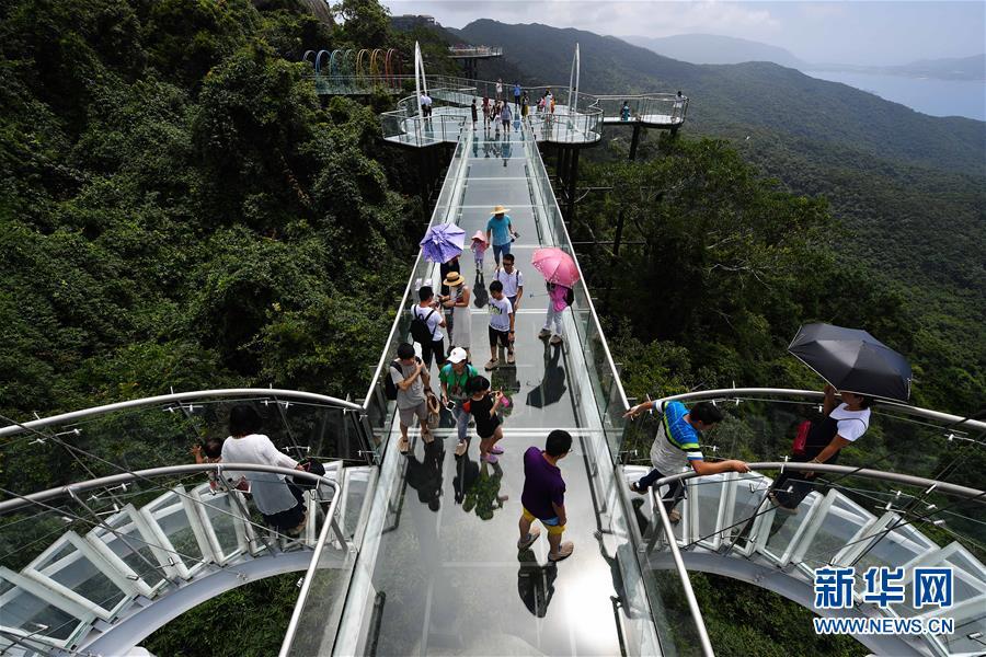 8月31日,游客在玻璃棧道上參觀游覽。近日,位于海南省三亞市亞龍灣熱帶天堂森林公園的大佛石全海景玻璃棧道開始正式營(yíng)業(yè)。凌空而建的玻璃棧道全長(zhǎng)400米,游客可將亞龍灣的美景盡收眼底。新華社記者郭程攝