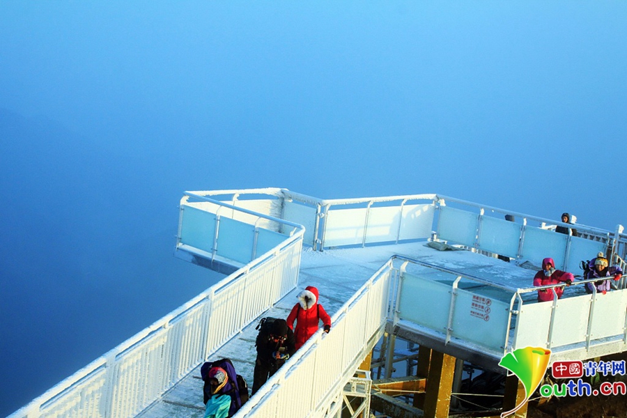 上到金子山最高峰可以看到,玻璃天梯像一條巨龍,沿著金子山最高峰山腰蜿蜒而上,每一個(gè)階梯都是玻璃做的,頂上是藍(lán)天白云,四周是莽莽群山,天梯下面是深不可測的懸崖絕壁。