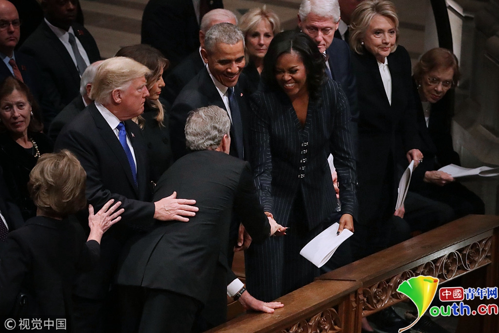 鏡頭捕捉到小布什從口袋里拿了疑似糖果傳給奧巴馬夫人米歇爾,兩人相視而笑。幾個月前,小布什也在前參議員麥凱恩的喪禮上傳糖果給米歇爾。