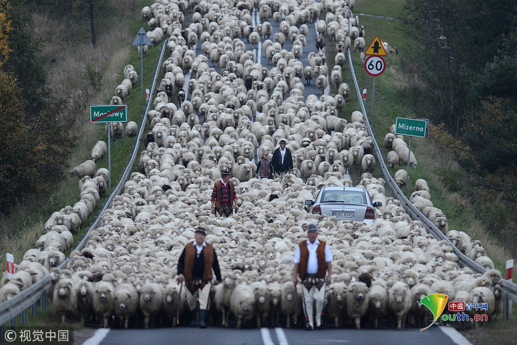 2018年9月27日訊(具體拍攝時(shí)間不詳),波蘭,浩浩蕩蕩的綿羊大軍為了趕在冬天之前回到農(nóng)場(chǎng)過(guò)冬,阻斷了鄉(xiāng)村的主車道。