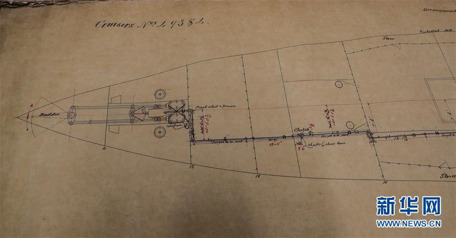 這是11月2日在英國紐卡斯?fàn)柕奶┒鳌枡n案館拍攝的致遠(yuǎn)艦設(shè)計(jì)圖紙。 新華社記者日前在紐卡斯?fàn)柼┒鳌枡n案館查找北洋海軍史料時發(fā)現(xiàn)一套七張、檔案名為“中國巡洋艦舵機(jī)設(shè)計(jì)圖”的原始圖紙。塵封百年,甲午海戰(zhàn)中抗擊日艦后沉沒的清北洋海軍致遠(yuǎn)艦部分原廠設(shè)計(jì)圖紙?jiān)谄浣ㄔ斓亍~卡斯?fàn)柺械囊患覚n案館首次被發(fā)現(xiàn),為打撈那段悲壯的歷史提供了重要參考。 新華社記者 韓巖 攝