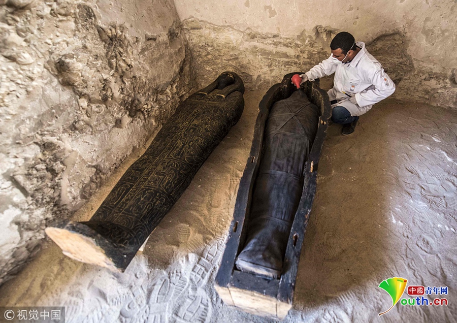當(dāng)?shù)貢r間2018年11月24日,埃及盧克索,考古學(xué)家在當(dāng)?shù)匕l(fā)掘出一處墓穴,在其中發(fā)現(xiàn)石棺、木乃伊等文物,時間可追溯至公元前4-7世紀(jì)。