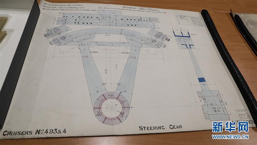 這是11月2日在英國紐卡斯爾的泰恩—威爾檔案館拍攝的致遠艦設(shè)計圖紙。 新華社記者日前在紐卡斯爾泰恩—威爾檔案館查找北洋海軍史料時發(fā)現(xiàn)一套七張、檔案名為“中國巡洋艦舵機設(shè)計圖”的原始圖紙。塵封百年,甲午海戰(zhàn)中抗擊日艦后沉沒的清北洋海軍致遠艦部分原廠設(shè)計圖紙在其建造地——英國紐卡斯爾市的一家檔案館首次被發(fā)現(xiàn),為打撈那段悲壯的歷史提供了重要參考。 新華社記者 韓巖 攝