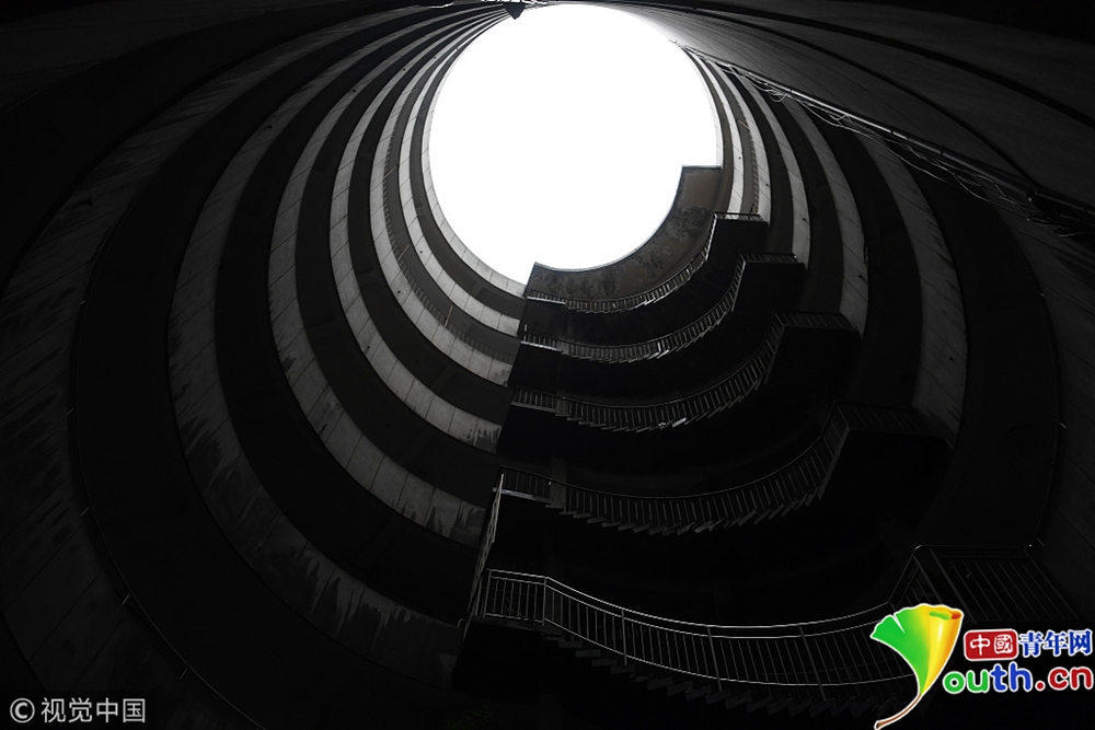 2017年9月27日,重慶,南岸區(qū)某小區(qū)的“螺旋”停車場,從公路到車庫要下5層樓,司機需要轉(zhuǎn)無數(shù)個360度圈。圖片來源:視覺中國