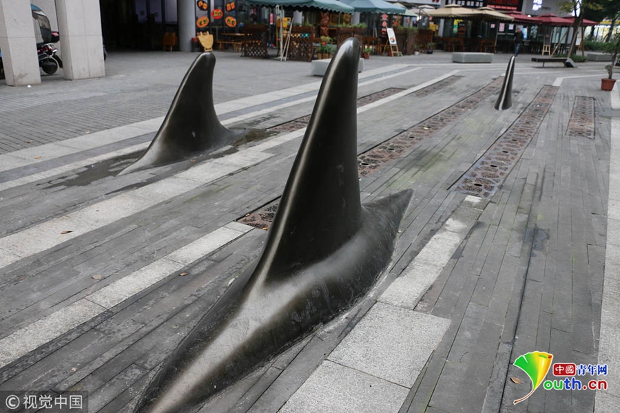 2018年11月20日,重慶一園區(qū)內(nèi)馬路中間突出一排“鯊魚鰭”,司機(jī)路人都被“嚇懵”了。突出的鯊魚鰭將兩側(cè)的車行道分開,原來(lái),這是為了進(jìn)一步保證車流的有序進(jìn)出和行人過(guò)街安全,同時(shí)也為了防止亂停車占用人行道,設(shè)置了這種異形“隔離樁”。圖片來(lái)源:視覺中國(guó)