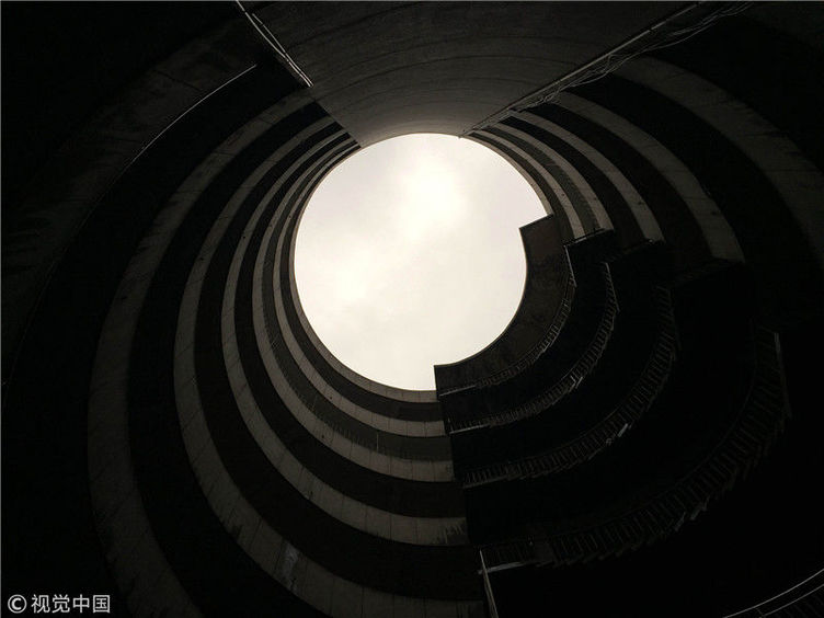 2017年9月27日,重慶,南岸區(qū)某小區(qū)的“螺旋”停車場(chǎng),從公路到車庫(kù)要下5層樓,司機(jī)需要轉(zhuǎn)無(wú)數(shù)個(gè)360度圈。圖片來(lái)源:視覺中國(guó)