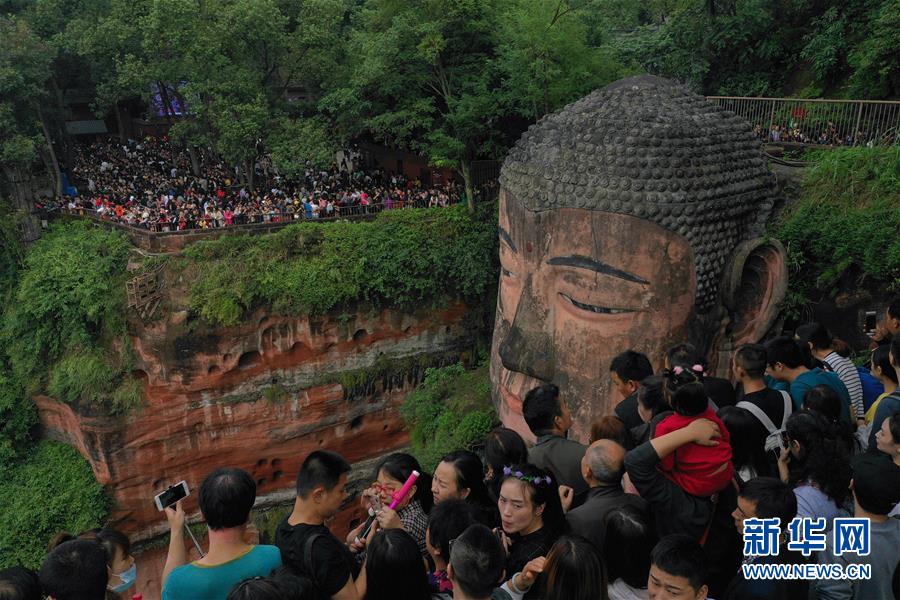 10月4日,游客在樂(lè)山大佛前排隊(duì)一睹大佛真容(無(wú)人機(jī)拍攝)?!⌒氯A社記者 江宏景 攝