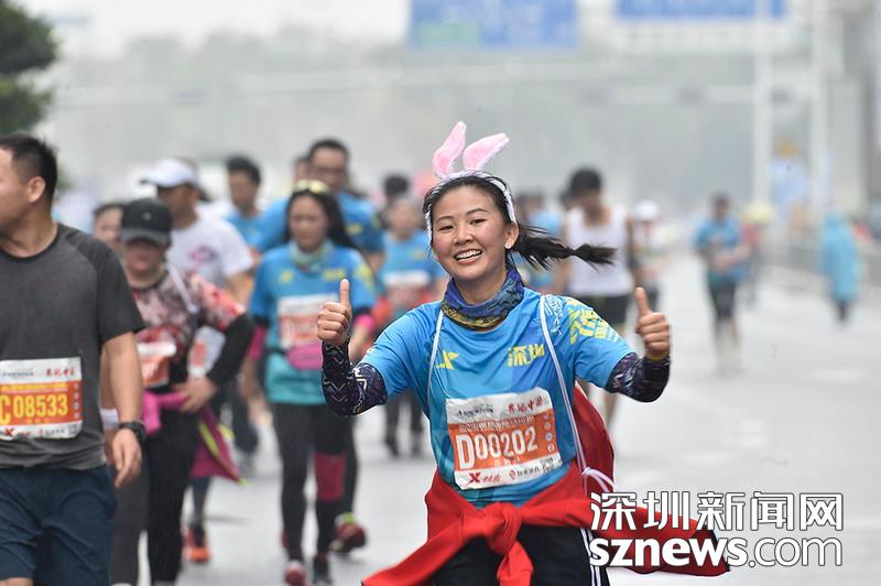 2018年12月16日,深圳國際馬拉松位于后海的折返點,即將抵達終點,選手對著鏡頭豎起大拇指。