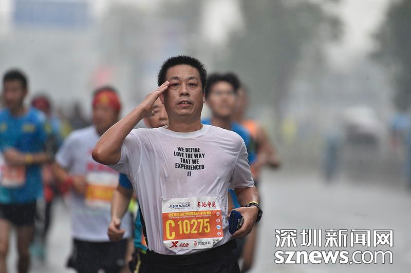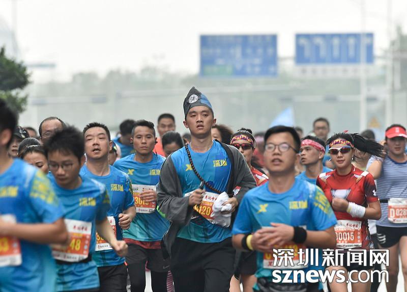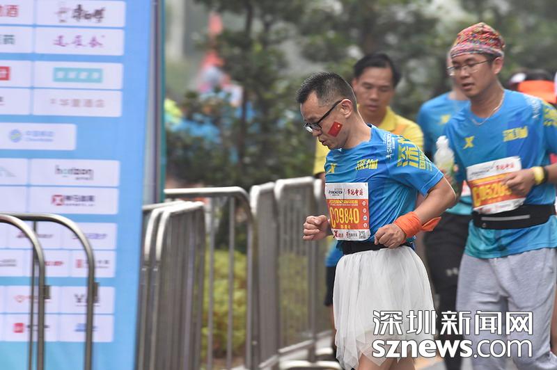 2018年12月16日,深圳國際馬拉松位于后海的折返點,三名選手正在向終點沖刺,跟其他選手不同,其中兩位選手選擇了自己搭配服裝參賽。