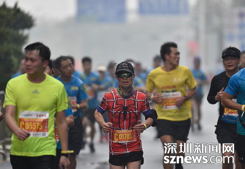 2018年12月16日,深圳國際馬拉松位于后海的折返點,一名身著“蜘蛛俠”短袖選手正在向終點沖刺。