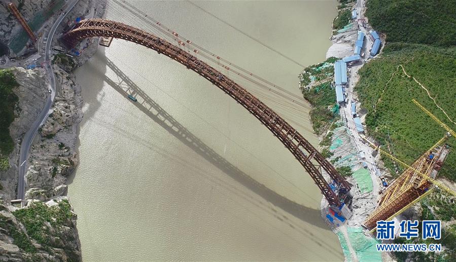 9月28日無人機(jī)拍攝的川藏鐵路拉林段重點(diǎn)標(biāo)志性工程藏木特大橋。 當(dāng)日,隨著最后一節(jié)鋼管拱的對位和鎖定完畢,川藏鐵路拉林段藏木特大橋成功合龍,標(biāo)志著大橋主體結(jié)構(gòu)施工取得了關(guān)鍵性勝利。藏木特大橋由中國中鐵廣州局集團(tuán)承建,拱高112米,橋橫跨雅魯藏布江峽谷,水深66米。 新華社記者普布扎西攝