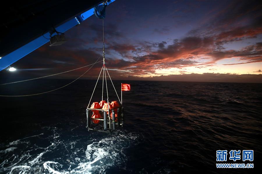 考察隊(duì)員在馬里亞納海溝“挑戰(zhàn)者深淵”海域布放“彩虹魚(yú)”著陸器(12月14日攝)。