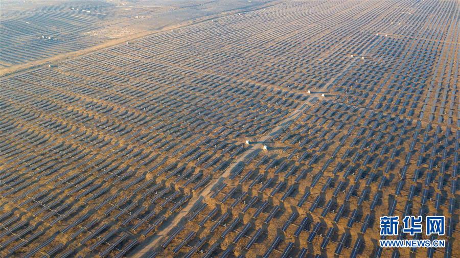 位于庫(kù)布其沙漠腹地的達(dá)拉特光伏發(fā)電應(yīng)用領(lǐng)跑基地一期500兆瓦項(xiàng)目(12月13日攝)。