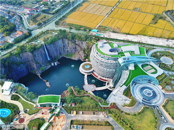 “深坑酒店”酒店主體建筑主要分為三部分:地上部分、坑下至水面部分、水下部分。其中,坑下至水面部分以建筑主樓為主;水下部分是酒店的特色客房區(qū)和特色水下餐廳。地面僅有2層,坑下水上14層,水下2層,地面兩層主要包括觀星臺、大堂吧、宴會廳、會議室等等,大堂以“地心奇遇”為主題,墻面立體,呈古銅色,與礦坑巖層相呼應(yīng)。