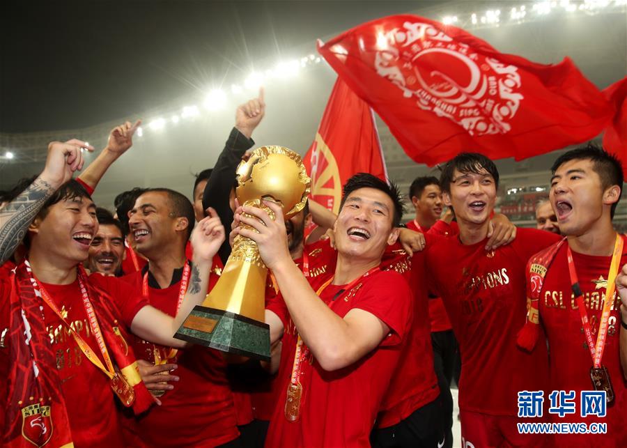圖為2018年11月7日,上海上港隊球員武磊(前中)在慶祝奪得本賽季中超聯(lián)賽冠軍的資料照片。 新華社記者丁汀攝