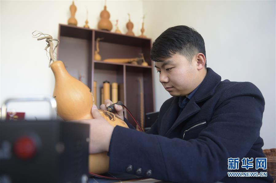 12月18日,劉征在自己的加工坊里進行葫蘆烙畫創(chuàng)作。  新華社記者 魯鵬 攝