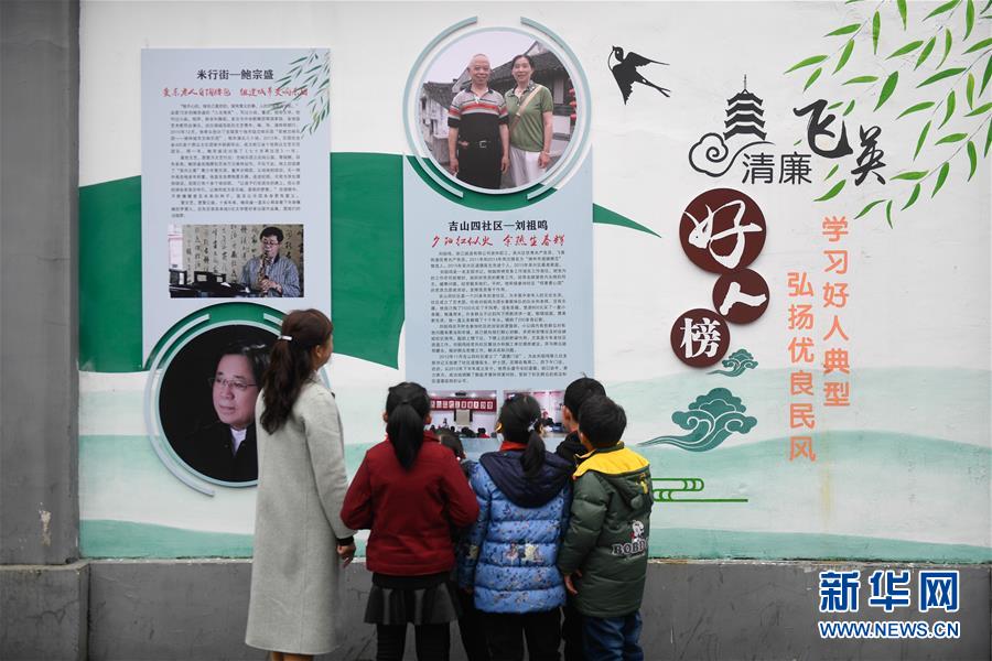 12月19日,小學(xué)生在湖州市吳興區(qū)飛英街道眠佛寺街觀看好人榜的事跡介紹。 新華社記者黃宗治攝