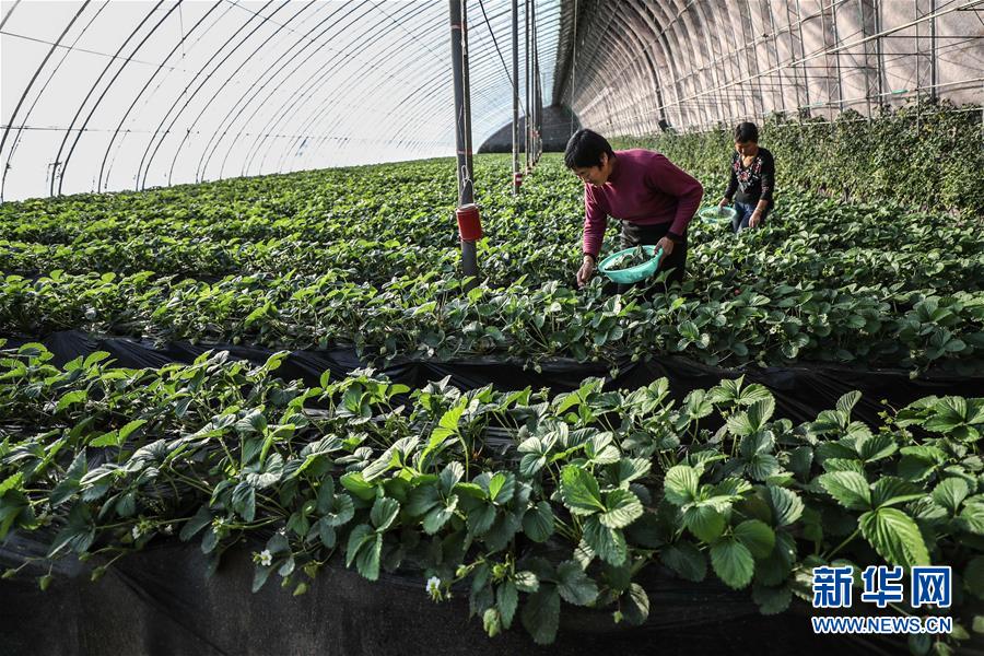 12月19日,農(nóng)戶在大棚里管理草莓。 2017年5月,遼寧省鐵嶺市昌圖縣大四家子鎮(zhèn)方家船口村利用土地確權(quán)成果,由村兩委班子成員領(lǐng)辦創(chuàng)辦了昌圖久晟果木蔬菜種植專業(yè)合作社。到2018年9月,合作社利用產(chǎn)業(yè)扶貧資金、壯大村集體經(jīng)濟(jì)扶持資金、村集體用地和村民入股資金建成了11個(gè)“股份制大棚”,主要種植草莓等作物,產(chǎn)品通過(guò)電商銷往云南、四川、北京、上海等地,預(yù)計(jì)第一期可為265名貧困戶每人分紅860元。 新華社記者潘昱龍攝