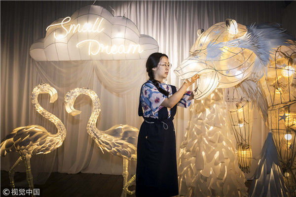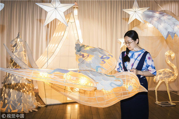 2018年5月6日,廣州,在天河區(qū)一家大商場(chǎng)辦個(gè)展時(shí),用紙片做成的北極熊、大松樹、火烈鳥、紙房子在光線的配合下美輪美奐,吸引了很多顧客駐足?!皫缀趺總€(gè)人一看到,都會(huì)走進(jìn)那個(gè)夢(mèng)幻的場(chǎng)景里,和這些紙雕一起合影。”圖片攝于2018年5月6日。南塘/視覺中國(guó)